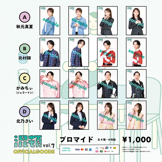 仕様:L判(89mm×127mm) 「混頓vol.7」オリジナルブロマイド4枚セット ラインナップ 秋元真夏、北村諒、かみちぃ(ジェラードン)、北乃きい ※順次発送となりますので、3週間以内での発送を予定しております。